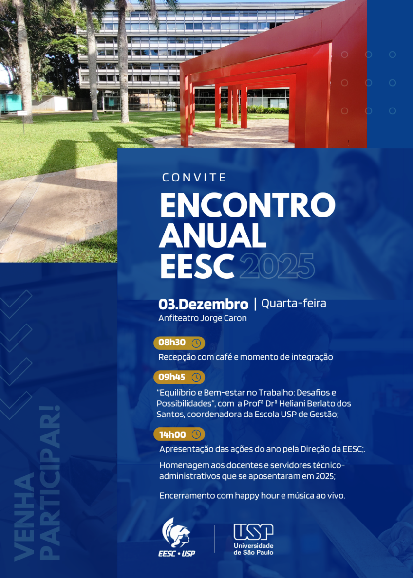 Termina nesta sexta-feira, dia 28, o prazo para docentes e servidores técnico-administrativos confirmarem participação no Encontro Anual da EESC-USP - 2025.